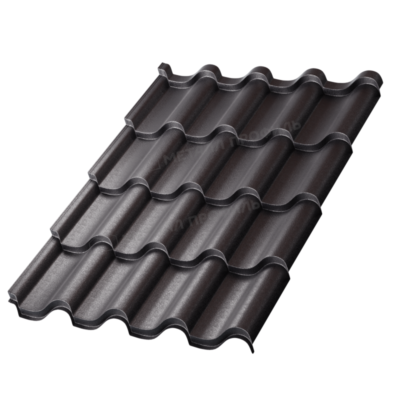 Профиль Монтерроса-ML характеризуется симметричной волной, имитирующей натуральную черепицу с мягкими, плавными линиями. Высота волны составляет 24 мм, а шаг — 350 мм, что обеспечивает отличную жесткость и простоту монтажа. Этот профиль разработан для крыш с уклоном от 12 градусов, позволяя эффективно отводить воду и снег. Материал изготавливается из высококачественной стали толщиной 0,5 мм, что делает его легким, но прочным. Форма профиля минимизирует ветровые нагрузки и обеспечивает акустический комфорт, поглощая шум от дождя. В цвете Черный темный профиль выглядит элегантно и современно, подходя для различных архитектурных стилей.
